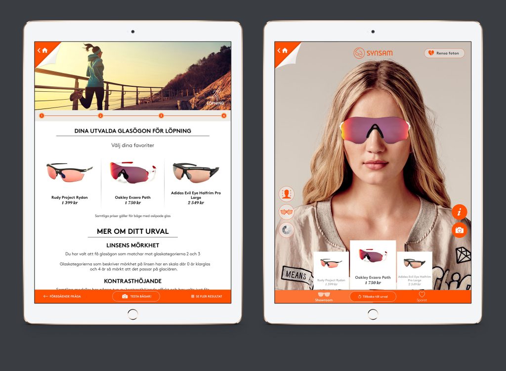 I appen använder man OpenCV för ansiktsigenkänning, och appen placerar blixtsnabbt glasögonen på ansiktet. Dessutom har appen funktioner som kalibrerar förhållandet mellan ansiktet och den verkliga storleken på glasögonen, för att säkerställa att resultatet blir så nära verkligheten som möjligt. Appen är integrerad mot Synsams E-commerce, vilket gör det enkelt och stabilt att uppdatera innehållet och har bidragit till appens framgång. Strax efter release låg appen på andra platsen på topplistan inom sin kategori i App Store.